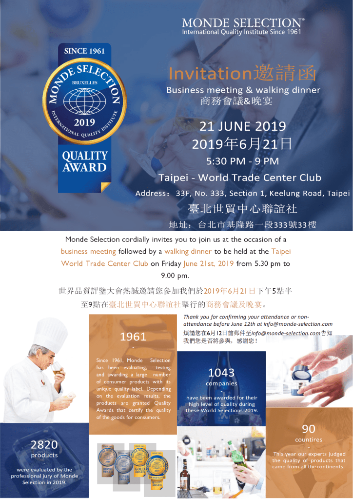 - Monde Selection商務會議&晚宴於2019年6月21日5:30 PM~9:00 PM在台北世貿中心聯誼社(地址:台北市基隆路一段333號33樓)舉行,歡迎大家踴躍和我報名參與。現場可以與Monde Selection大會工作人員現場交流產品參選事宜。 同時歡迎您來2019年19至22日台北食品展參觀世界品質評鑒大會(Monde Selection)和盛澤國際有限公司的位於世貿一館比利時聯合展臺內的B1222展位參觀交流。