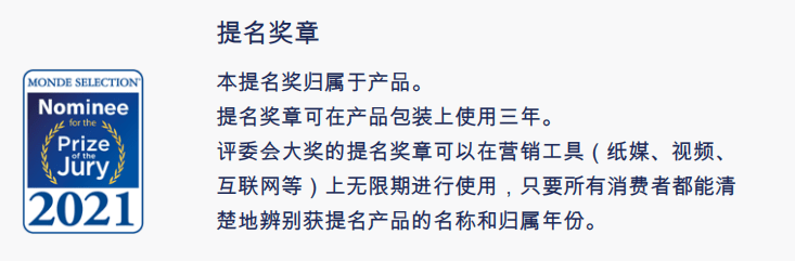 每年3千多件參選產品的Monde Selection評鑑中,每一評鑑類別的產品中只有5件產品可以獲得評委會大獎提名,最終角逐該類別的評委會大獎,成為評審團的“心動之選”。