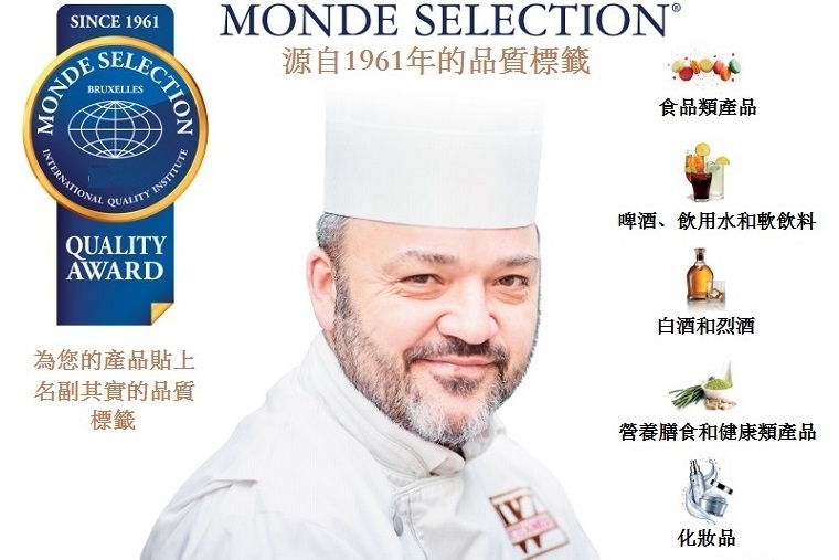 自1961年起,Monde Selection對眾多消費產品的品質進行分析和評估,並為其頒發獨一無二的品質標章。每年80位國際專家以完全獨立的方式品鑑和測試來自世界各地的產品。 根據所獲的結果,這些產品將獲頒向消費者證明產品品質的品質獎項。 通過參考科學和食品相關法律的方式,Monde Selection的評鑑過程遠遠超出了常規品嚐。評審團在仔細評估每個產品時,成員會分享討論其相關的知識和經驗。
